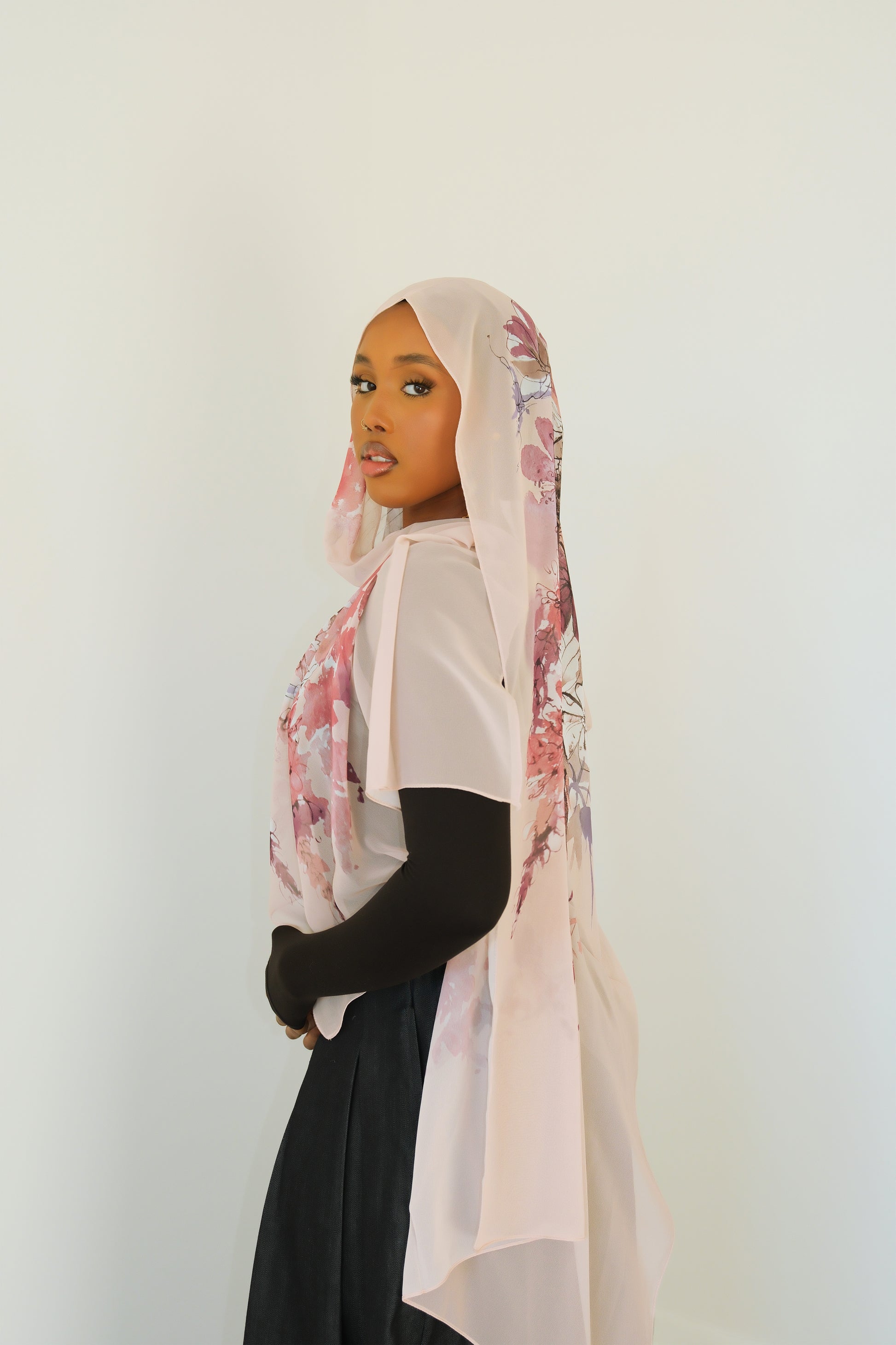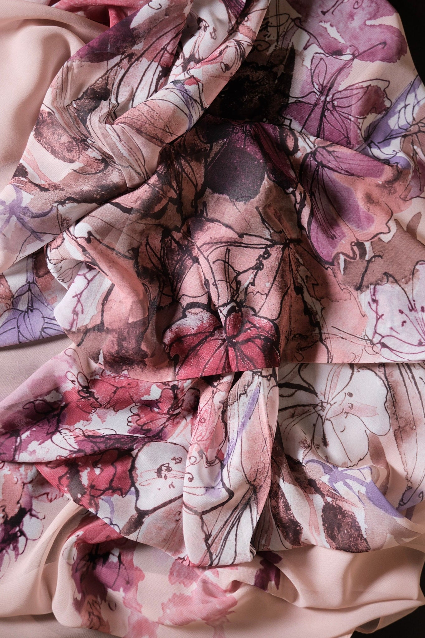 A luxurious silk scarf elegantly arranged, showcasing its soft texture and floral design.