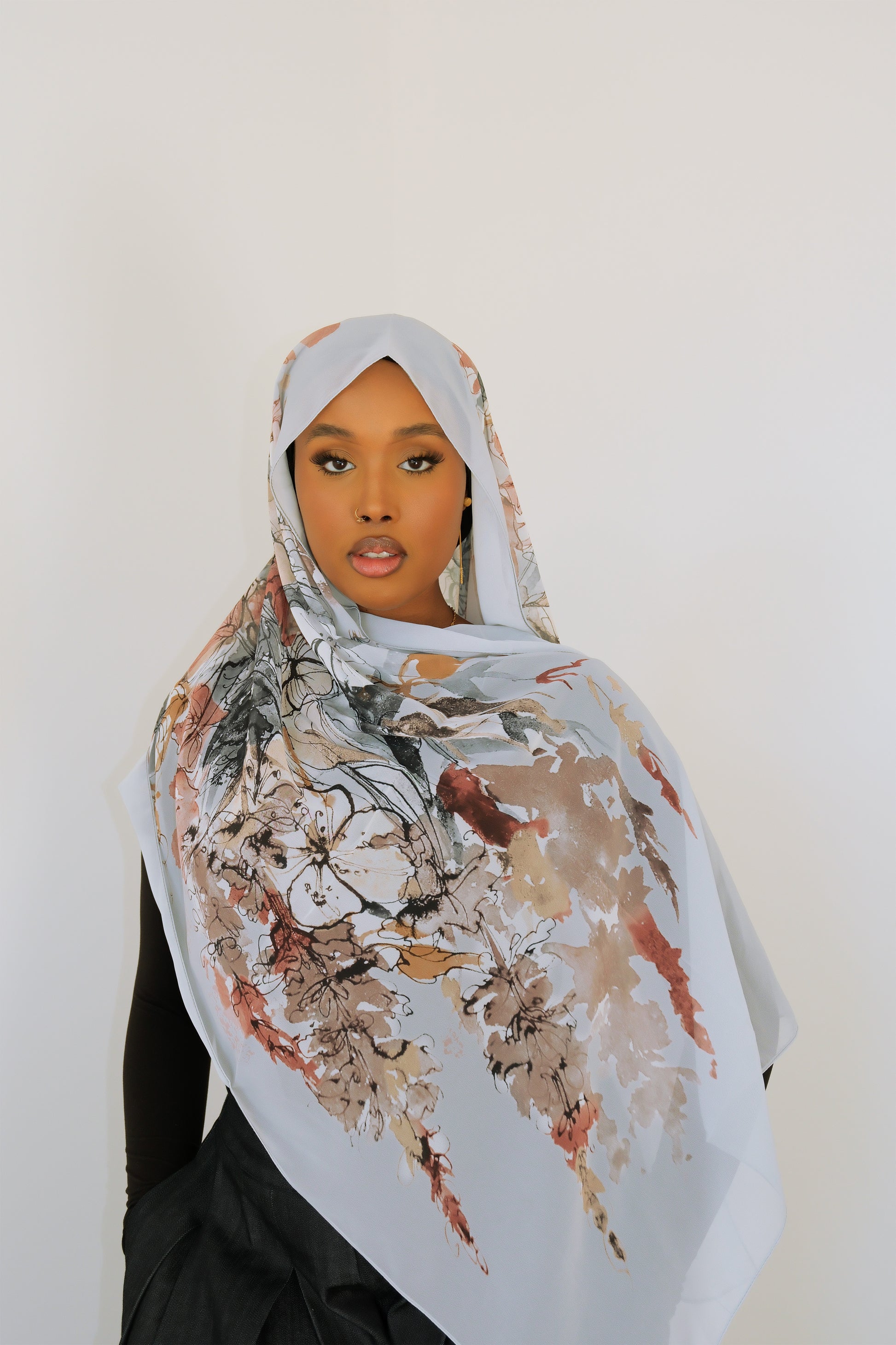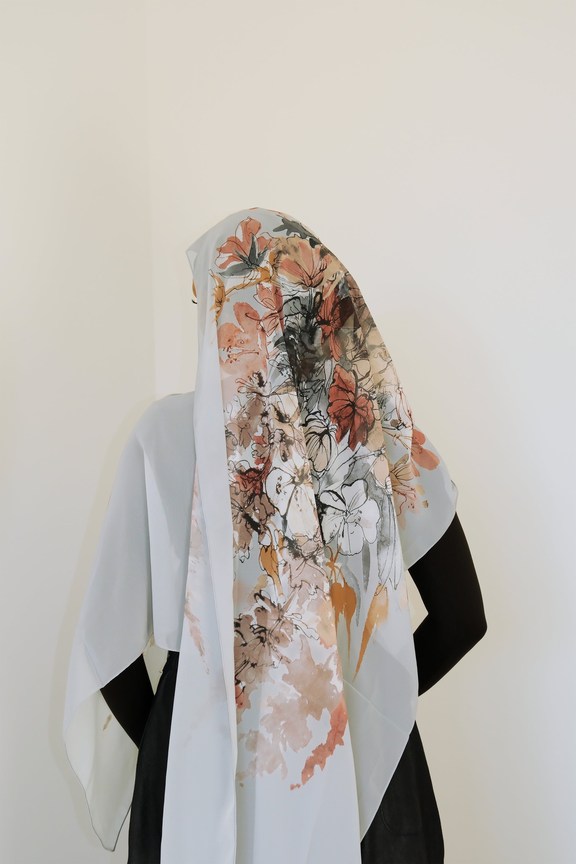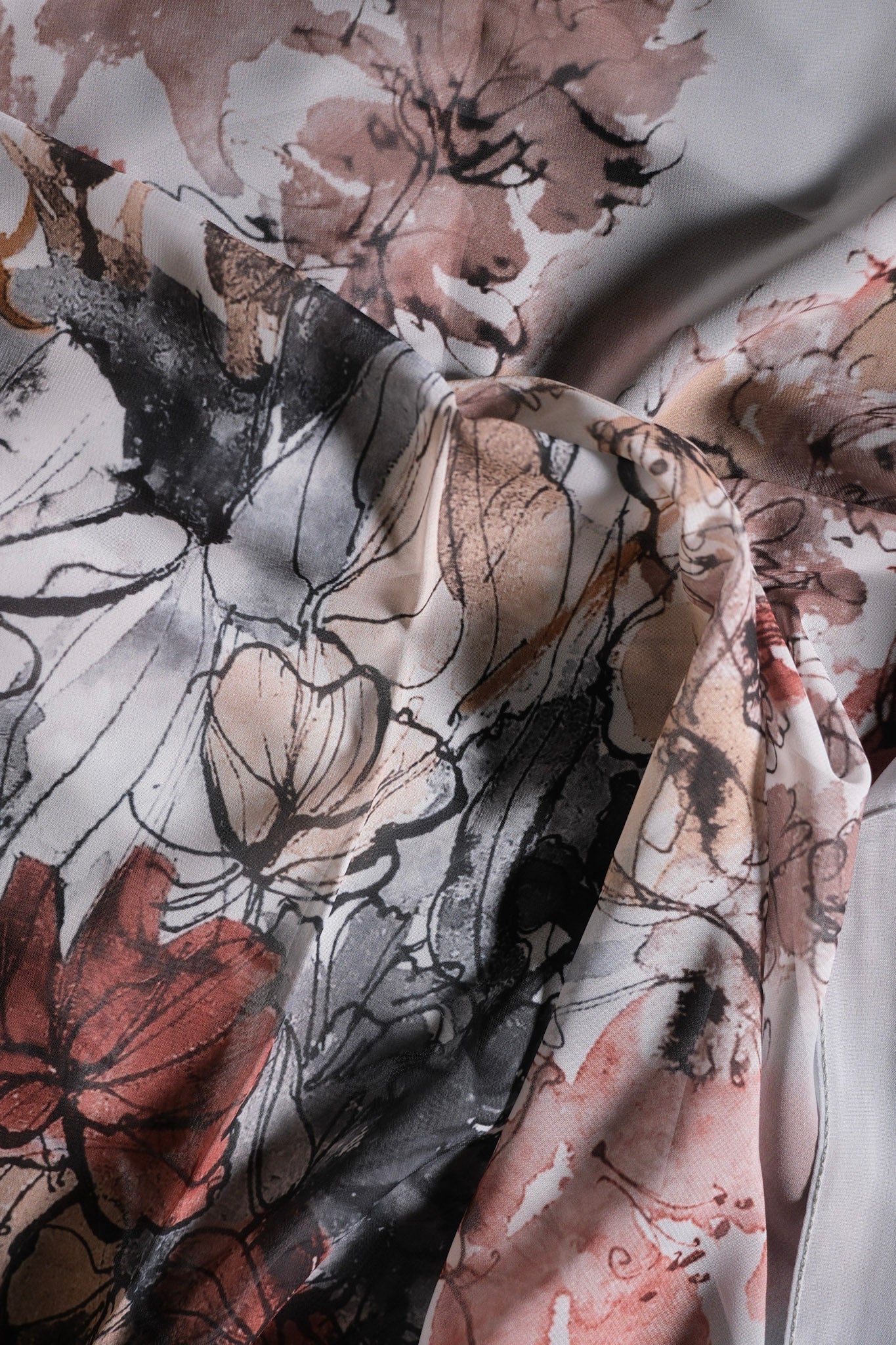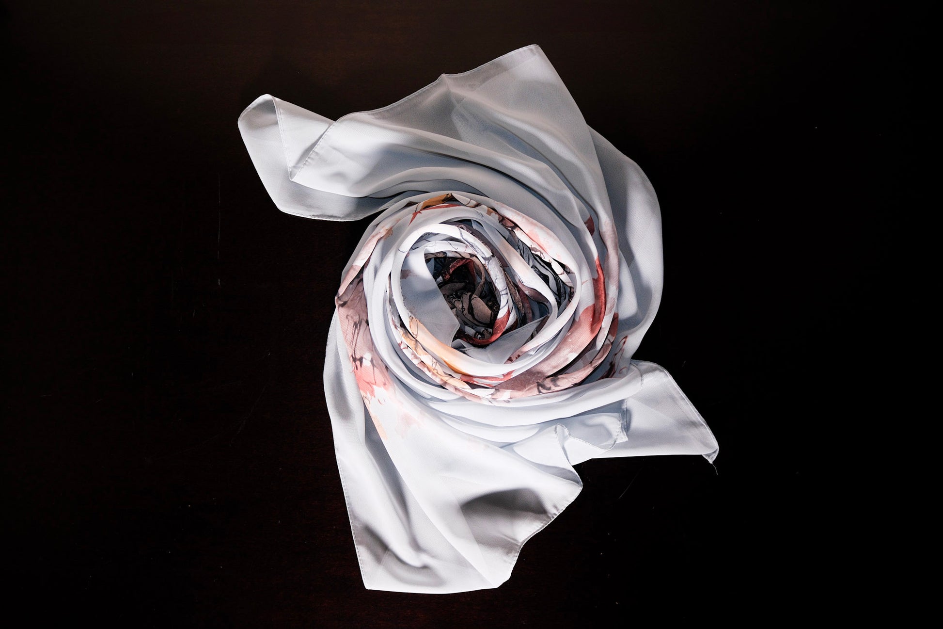 A luxurious silk scarf elegantly arranged, showcasing its soft texture and floral design.
